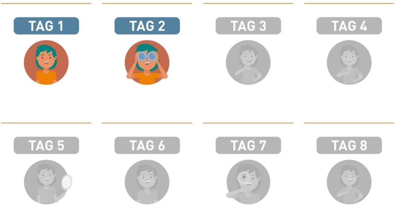 In den Selbstreflexionsmaterialien vom DigikoS-Projekt wurden acht Umfragen zur Selbsteinschätzung so miteinander verknüpft, dass Lernende immer genau wissen, welche Umfrage als Nächstes dran ist. Die Seite wurde dafür mit 16 Kacheln gestaltet: acht graue (gesperrt) und acht bunte (freigeschaltet).
