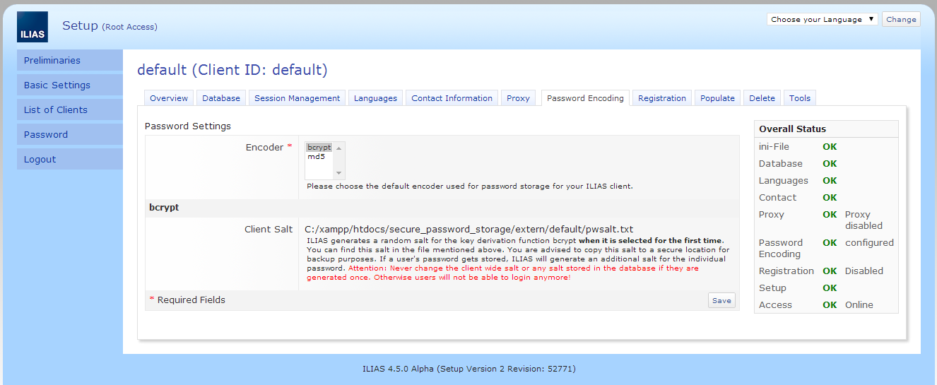 Furthermore ILIAS generates a random salt for the key derivation function bcrypt when it is selected for the first time. You are advised to copy this salt to a secure location for backup purposes. Each time a user's password gets stored, ILIAS will generate an additional salt for the individual password. Never change any salt used by ILIAS if it is generated once. Otherwise users will not be able to login anymore!