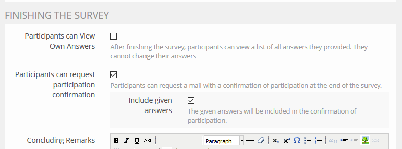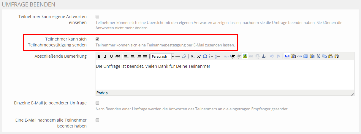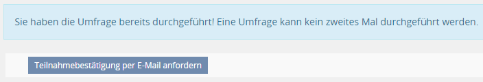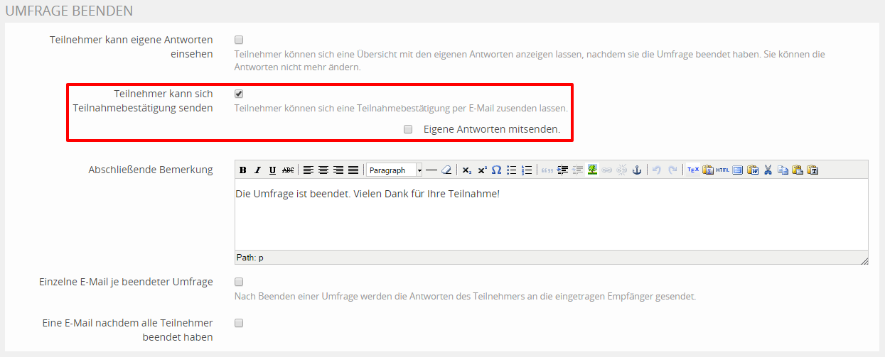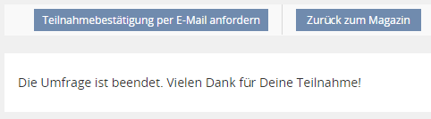 In our context the participation in a survey is a mandatory examination task. Thus for the participants of a survey it will be useful to get an automatical e-mail notification as a result when they finished the survey. Although the surveys has to be anonymous, the participants can then print out this e-mail notification to prove their supervisor that they have participated in the survey.