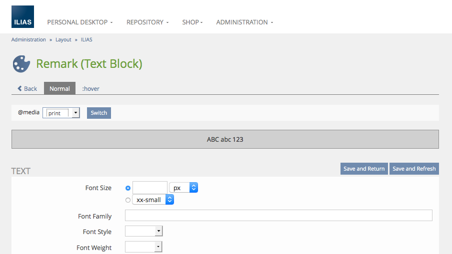 The current style sheet editor for content styles in ILIAS pages does not support media rules yet. Therefore it is not possible to define different behaviour for the same style in different displays (computer screen, mobile device, ...).