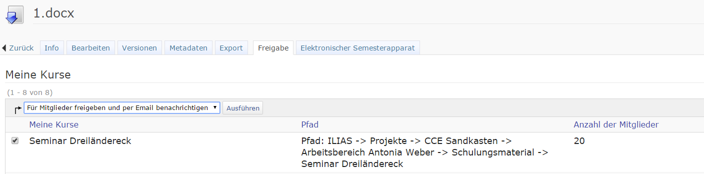 Since the users don't know when a new file or blog is shared, we added the button "Share and notifie by mail" next to the "Share"-button. The user can notifie users, groups and courses (the option "everybody" is not available in our installation).