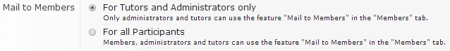 - The setting "Mail to Members" in groups/courses is set to "All Participants", if the member role has the "Send mails to local roles" permission. This means the setting reflects and sets the permission for members directly.