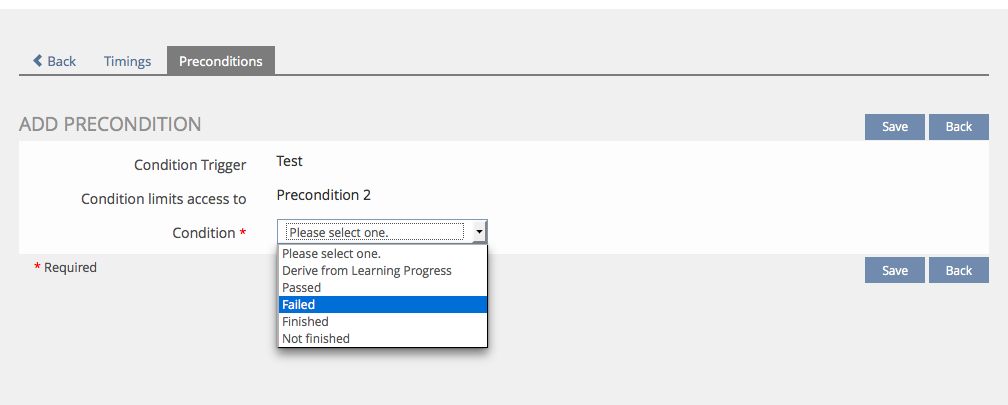 - New precondition "failed" : This new precondition makes it possible to present an object when a previous test, SCORM module or exercise has failed by the user. All object types (also new ones) that have such a "failed" status should support such a precondition.