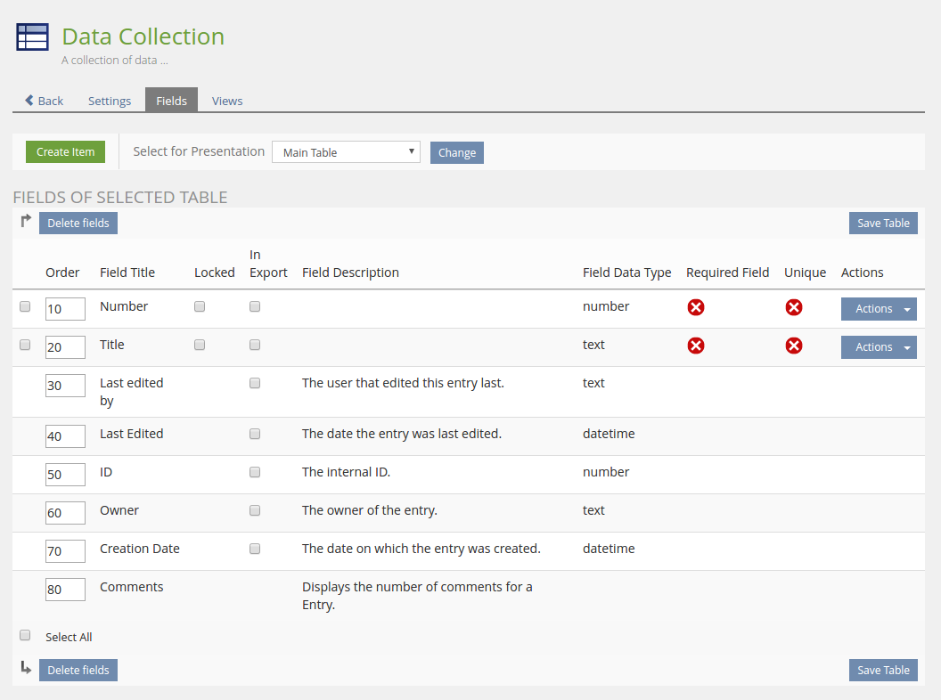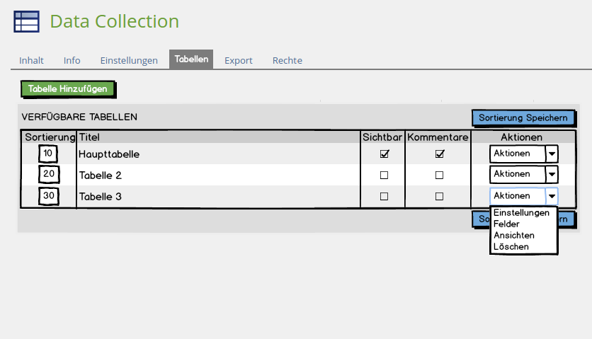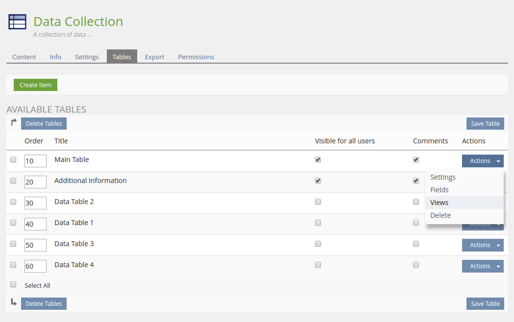 An overview of all tables and the possibility to add new tables, delete existing ones, define an order (see DataCollection: Sorting of tables) and change the settings 'Visible for all users' & 'Comments'. The heading 'Comments' additionally has a tooltip ("Enable public comments for Entries") for better understanding. The Actions-menu allows a user to navigate to the different table settings (see below).