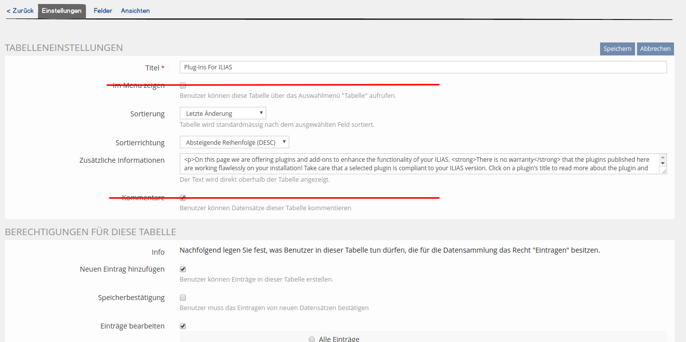 Further, the properties 'Visible' and 'Comments enabled' will move from the table settings to this GUI (see Screenshot 'Sichtbar' and 'Kommentare')