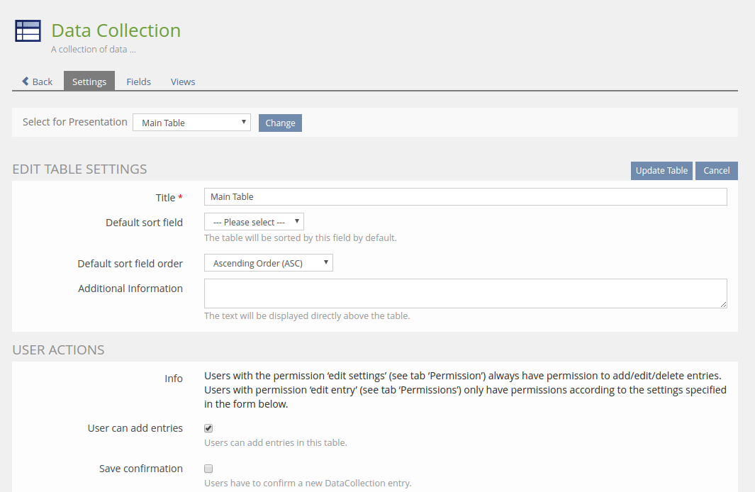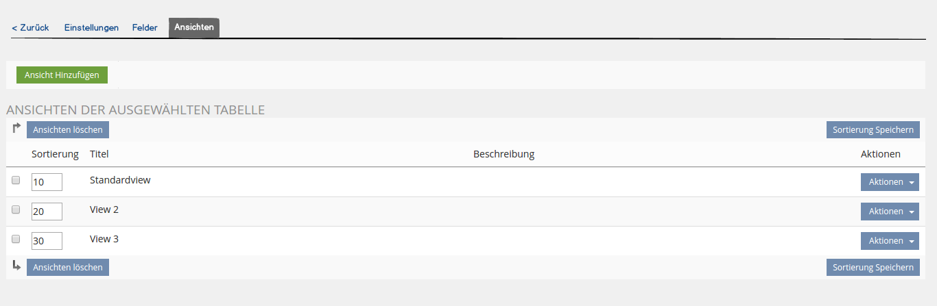 Via the actions menu, one can navigate to 'Settings', 'Fields' and 'Views'. They lead to the usual GUIs for the tables settings, fields and views, however these three GUIs will now be in the same context. That means, while in one of these GUIs, the tabs available will be 'Settings', 'Fields' and 'Views', as well as a tab '< Back' for the navigation back to the tables overview. (see Screenshots below).