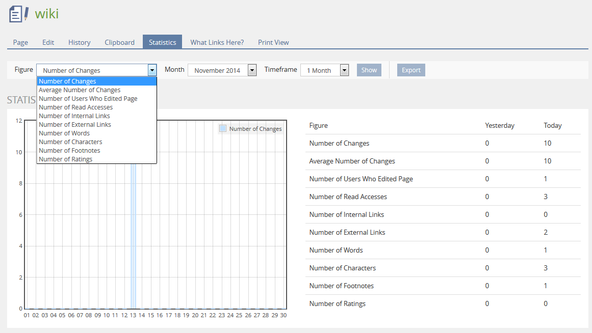 regarding the entire wiki, total and average (per user) numbers of: | regarding single pages in the wiki, total and average numbers of: | |