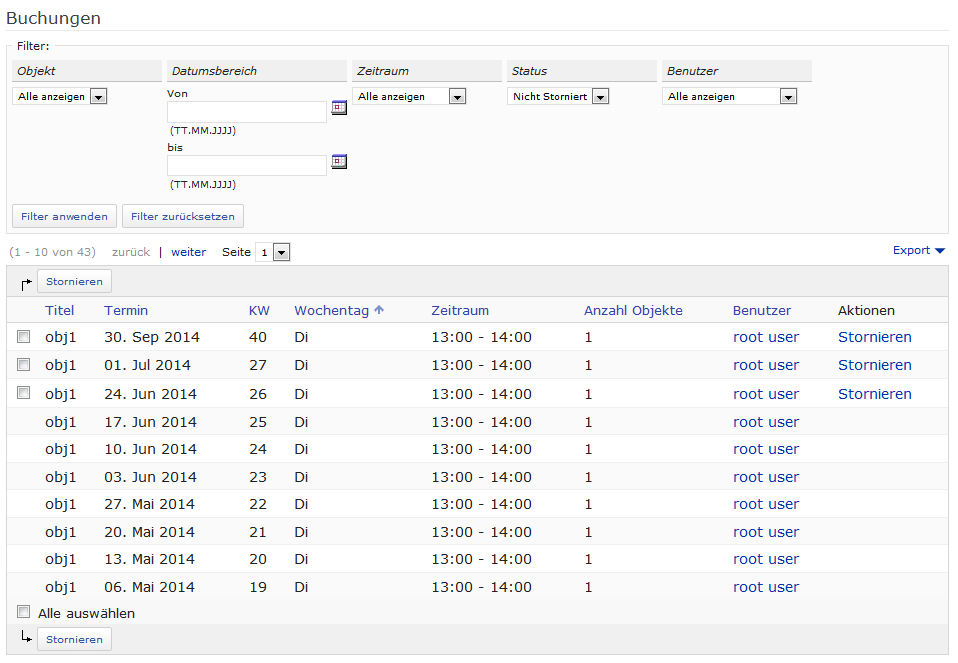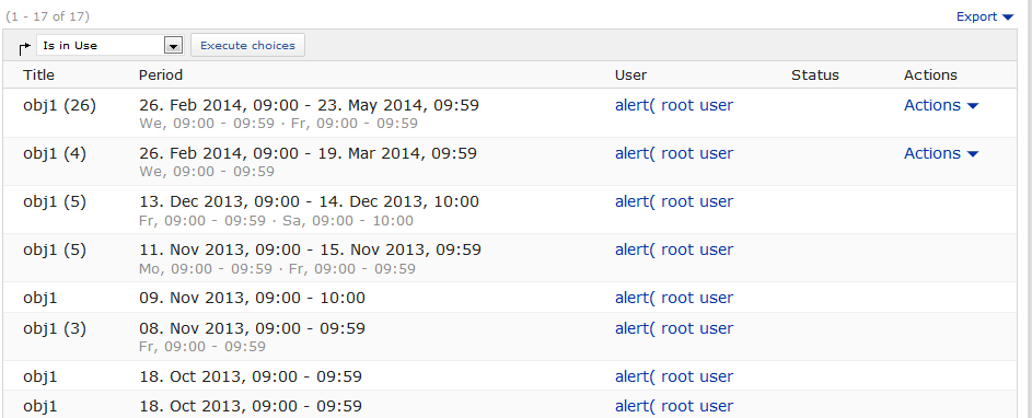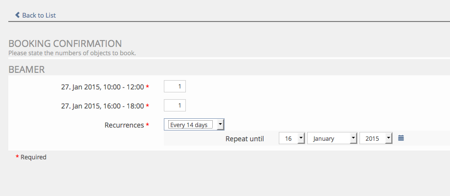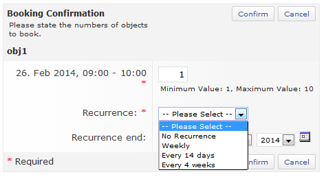 Matthias Kunkel, 16 Jan 2015: There is one usability issue in the booking workflow that should be fixed: On the screenshot below I have booked an object starting at Jan 27 for "every 14 days". Now I have to define an end date for recurrence. Fine! But why does it offer me "16 January 2015" as first value? A date that lays in the past when the first booking takes place. It shouldn't be that difficult to show a reasonable date for this date field. And reasonable would be e.g. 10 February 2015 (=Jan 27 + 14 days).
