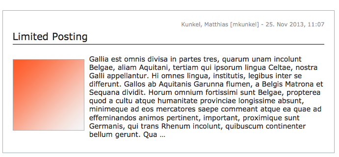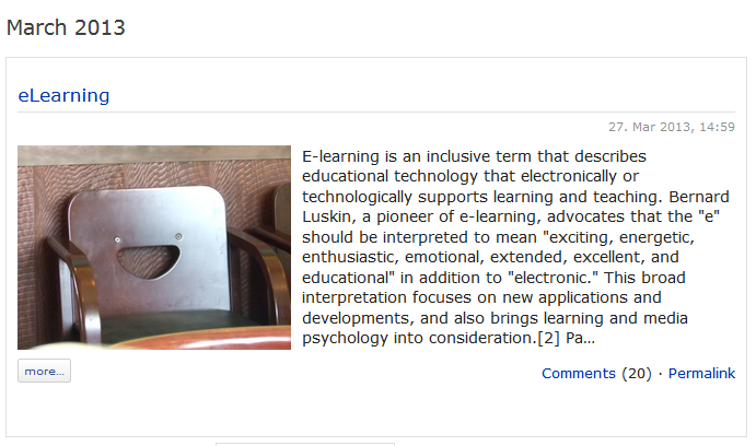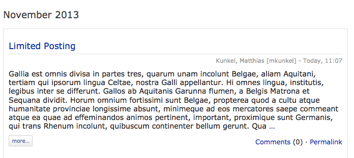Limiting the length of a paragraph in preview : A lot of blog authors write the entire blog posting in one paragraph - like they are used from Word or other tools. This has a bad effect as ILIAS shows always the entire text of the first paragraph - and therefore showing the postings already in full length and not as a trigger.