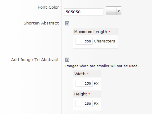 - Values for maximum length of shortened abstract as well as width and height of image are set (e.g. 500 characteres, 144x144 px).