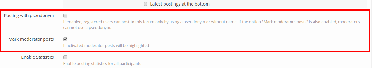 The settings Posting with pseudonym and Mark moderator posts are now close to each other. The description of the latter was changed according to the new behaviour.