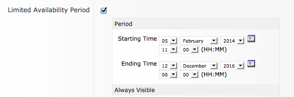 v2: In the course-settings, ILIAS users can change the default "Starting Date and Time" (actual date) and "Ending Time" (actual date + 10 month = 24. 01. 2014 - 12. 12. 2014). Starting and Ending TimePicker are independent (a change in the Starting Time does nothing in the Ending time, and vice versa).