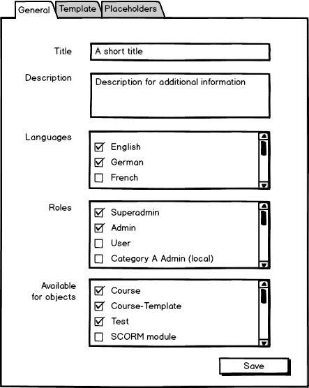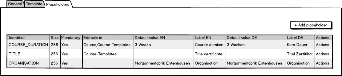 - Labels: The labels used to describe the placeholder in the form. Could also be available as placeholder in the layout with a given prefix, e.g. [LABEL_TITLE]