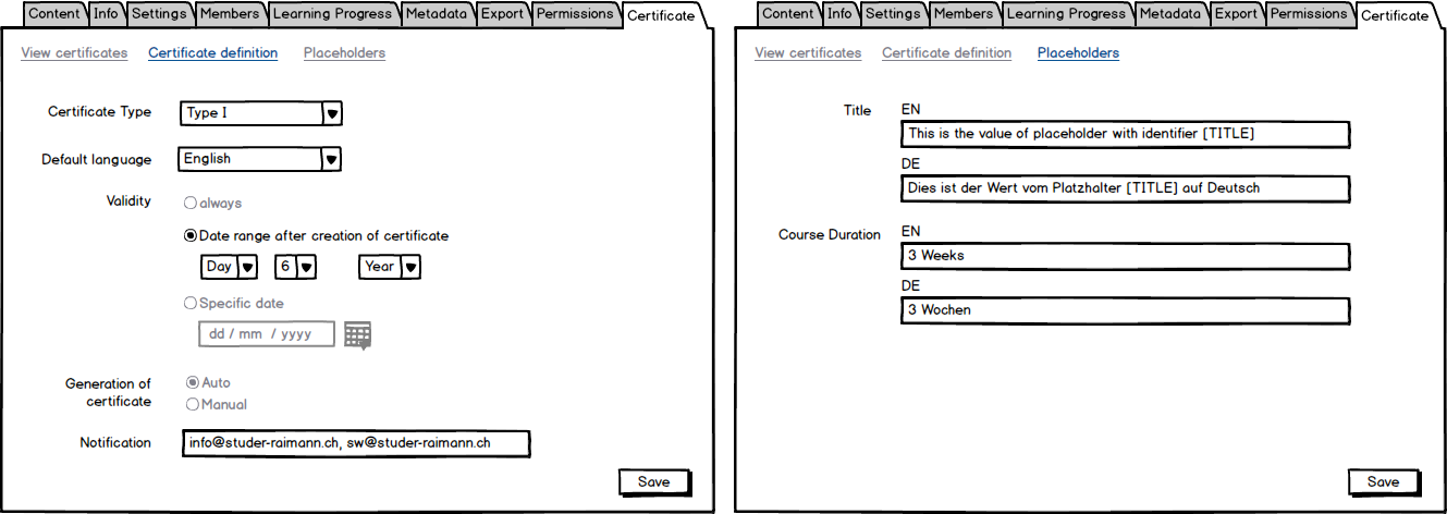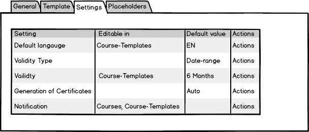 An object e.g. course defines the certificate settings under a tab "Certificate". First step is to choose an available certificate type. Based on the type, the course admin can override the settings and placeholders defined as editable.
