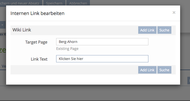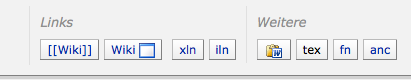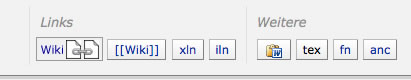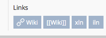 We introduce a new additional button for creating wiki links with a similar dialogue as outlined above. But I do not have a good idea how this button should look. The current wiki link button has "the syntax" already in the button, which is good. The second button should somehow state that it opens a dialogue popup, maybe using some sort of icon? The xln/iln Links are critized a lot for their look, too. Maybe this could be improved altogether.
