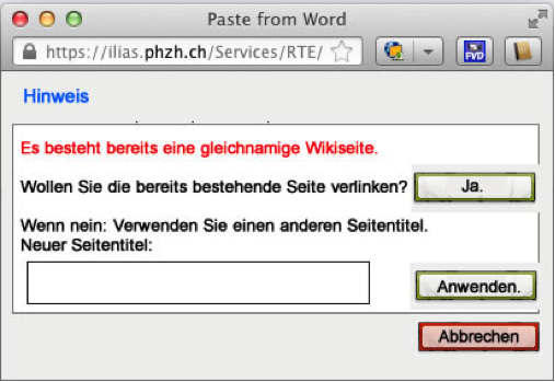 "As a first step after clicking on the button Wiki in the ILIAS-Editor a page appears in which the "display text" is shown and fixed and only the "page name" is variable."