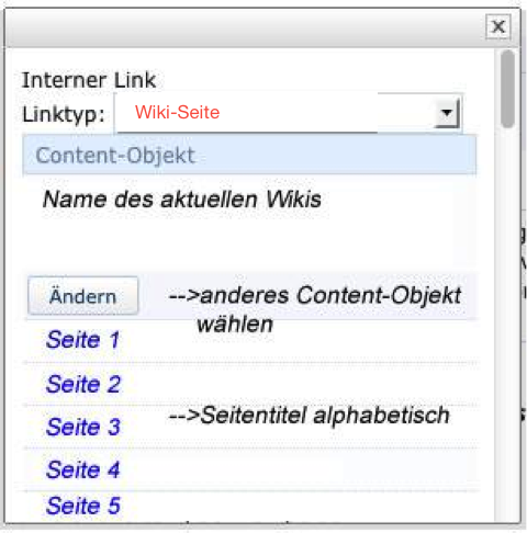 In a collaborative wiki the user would like to make a link to an existing page. Often the user doesn't know the correct name of the page. It would be nice, the ILIAS-Wiki listed the existing pages and the user could directly choose the link to the page.