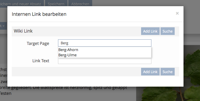 After clicking on the button Wiki in the ILIAS-Editor, a page appears in which the "display text" is shown but fixed. Only the "page name" is variable.