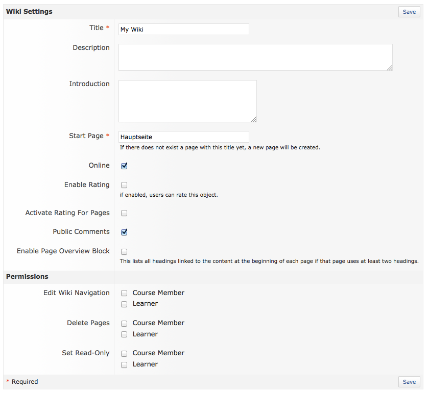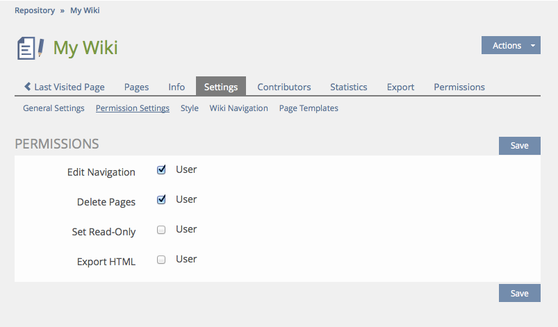- An ordinary user might not see a difference between "options" situated on the settings tab like "Enable Rating", enable "Public Comments" etc. on the one hand and enabling the right to "delete pages", enabling "HTML export" etc on the other hand. Therefore one might not search for those "options" on a permissions tab nor would one find those new "options" if they are not presented on the settings tab.