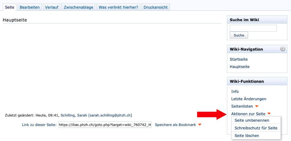 The functions will be presented in the block "Wiki Functions" in the dropdown-menu "Page Actions", if they are activated.
