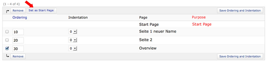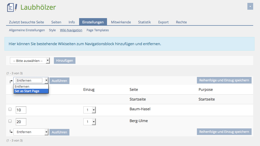 There the admin can determine the ordering of the wiki-pages. It would be nice if a wiki admin can choose any wiki-page and determine this page to a landing page. The newly set start page (landing page) should automatically be placed in top of the wiki navigation and use indentation "0".