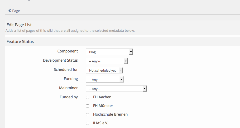 Matthias Kunkel, 05 Dec 2014: The interface for "Insert Page List" should mention what this feature does. Otherwise it is very difficult to understand. Example: "Adds a list of pages of this wiki that are all assigned to the selected metadata below."