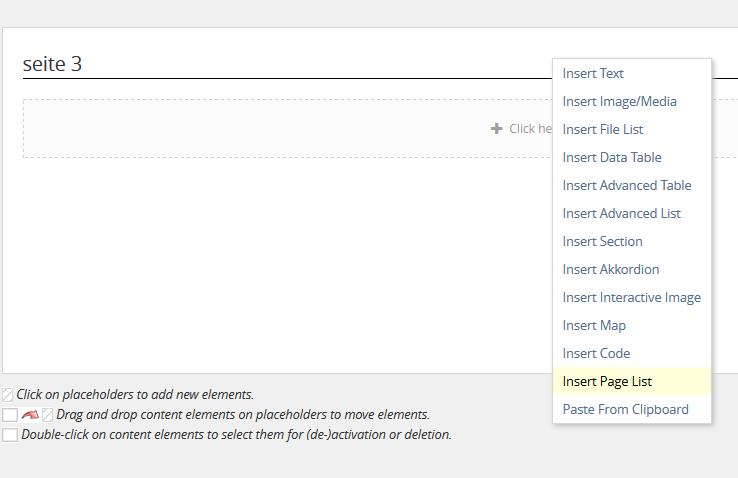 - The Page List entry "Seitenliste einfügen" in the page editor menu should not appear when no metadata set has been activated for the wiki.