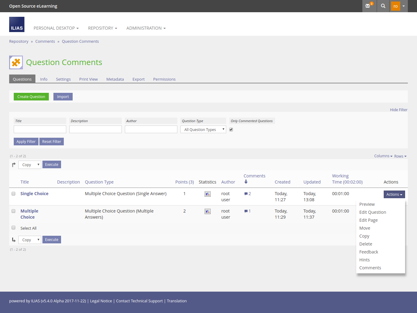 Commenting Questions directly from the questionpool is also possible. For every question the actions menu within the question list table provides a comments link that opens the modal with the comment feature.