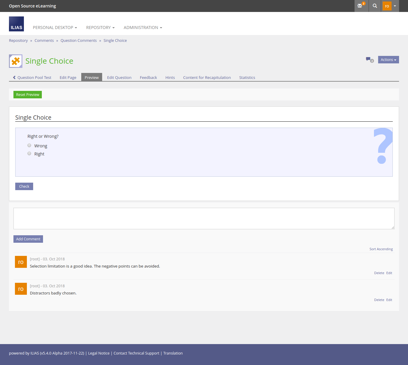 Creating test questions in a team over a long period of time requires co-ordination of effort, pointing-out issues with individual questions. in ILIAS 5.3 there is no option to add such information to a question.