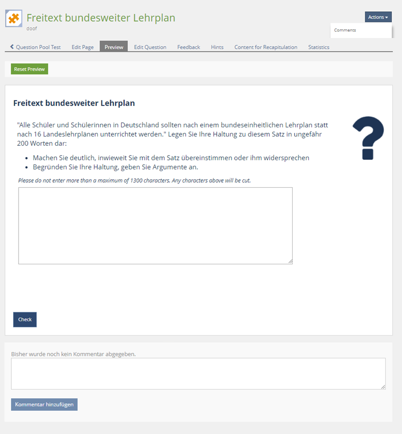 Adding Comments using the Top actions of the PreviewIn the Questions tab the action Comments is offered in the Action Menu. Clinking this Action calls for the normal Comments-Modal displaying the existing comments and offering to enter a new one.