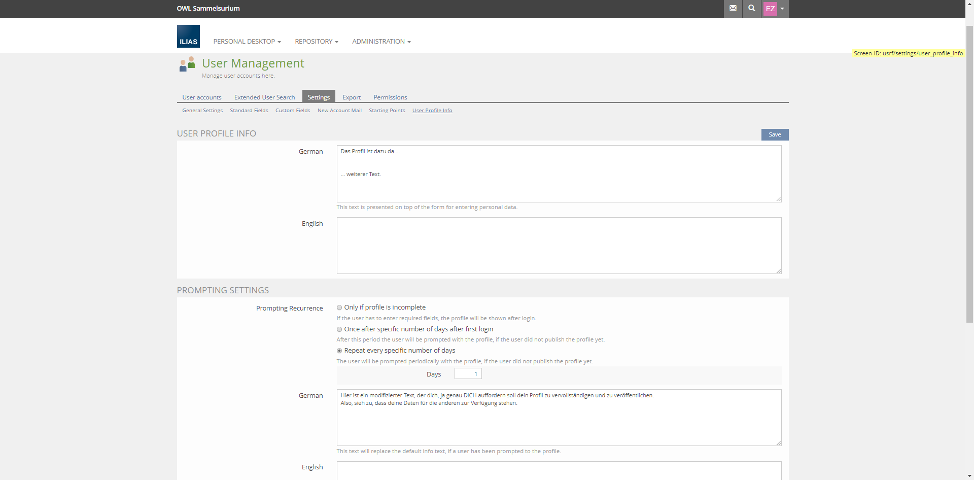 - If the prompt is activated for a user ILIAS force-dumps him or her on the first tab of the Profile. The prompt etxt is shown instead of the "normal" info message on top of the tab.