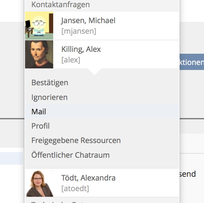 Some actions are missing in the dropdown: Suggestion: The "Dropdown-menu" in the contacts should have following entries: Send Mail (instead of Mail to) / Invite to Chat / Unlink / Confirm Request / Ignore Request / Cancel Requests