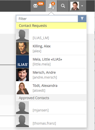 Filter: The filter does not run automatically like an auto-complete feature would do. The use has either to press enter or click the filter button. The filter looks for the entered string in the firstname and lastname (if visible) and in the account/login name.