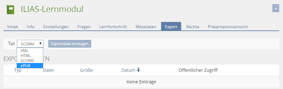 - Export tab of the ILIAS Learning Module: Add a new export type
