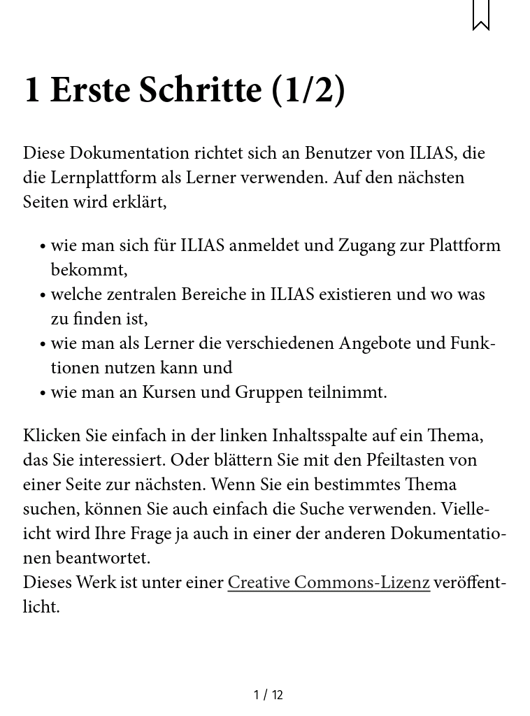 Here, as an example, a screenshot taken with a Tolino Shine using the first chapter of the German User Documentation for ILIAS 4.4, half-manually converted to ePUB: