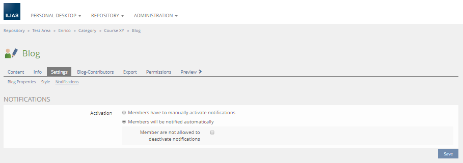 Blogs in Groups and Courses should also feature this subtab: Users with "Edit Settings"-permission should be able to define notfication behavior.