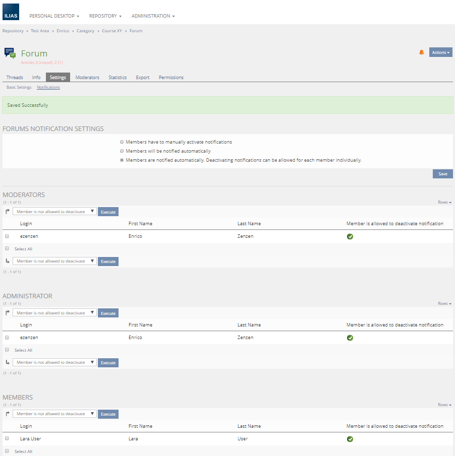 JourFixe, ILIAS [jourfixe], FEB 13, 2017: We appreciate this suggestion and schedule it for 5.3. We would like to have the labels streamlined (forum and blog). The third option of the forum ('Members are notified automatically. Deactivating notifications can be allowed for each member individually.') shall not be implemented.