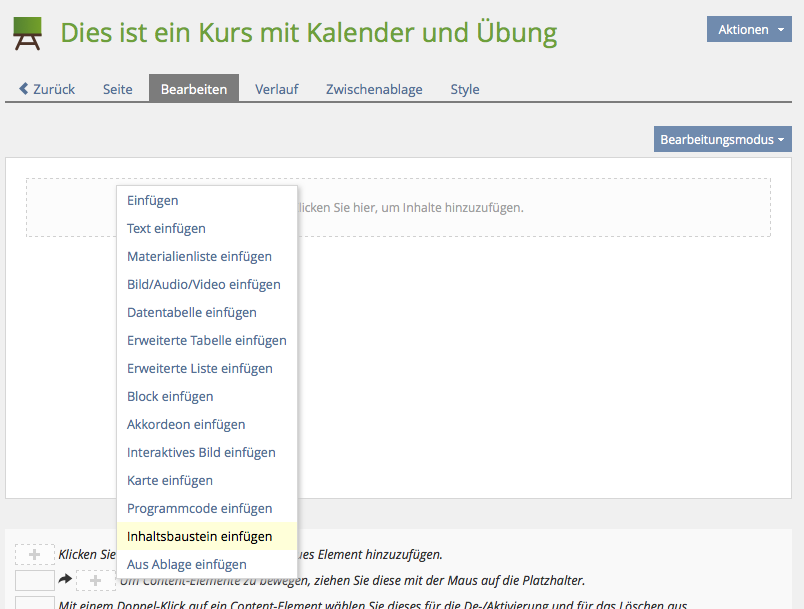 Now in courses and other containers the function to add snippets ("Inhaltsbausteine") will appear.