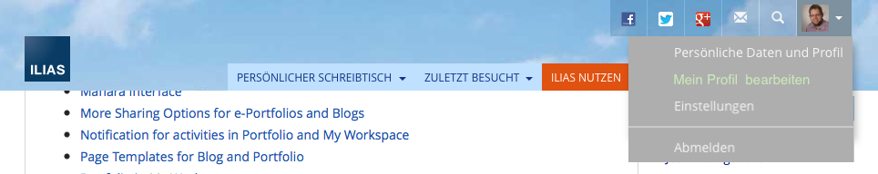 The Avatar (right in the header) provides access to the personal settings in the system (see, personal data and profile). "Show my profile" can be an alternative to "edit my profile" | Der Avatar (rechts in der Kopfleiste) bietet Zugriff auf die persönliche Einstellungen im System (vgl. persönliche Daten und Profil). Alternativ zu "Mein Profil bearbeiten" könnte auch "Mein Profil anzeigen" umsetzen. |