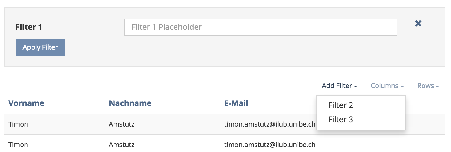 - Only the first defined Filter Item will be shown in the Filter. Every other Item must be added through the "Add" Field.
