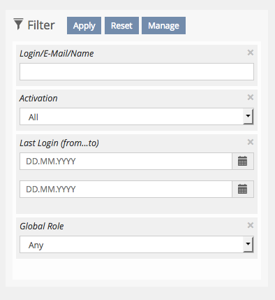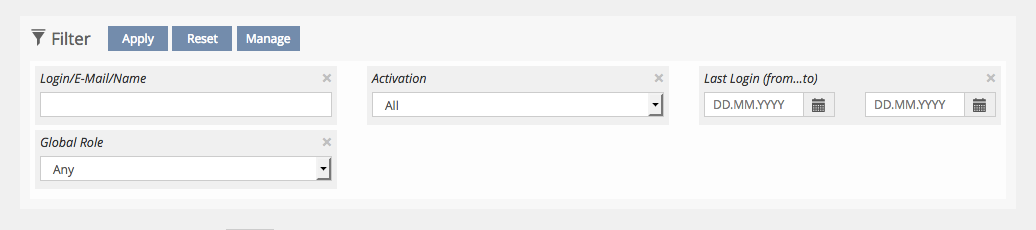 By clicking on the filter item the user opens a popover that contains the input elements to change the filter values. One filter item can contain a single field as well as a group of fields. This is usefull to group fields that are most often used together (like some filter item for a time period) or that are often used optionally (like login, firstname, lastname), where most of the time only one of the fields will be used. Note that even the filter items that do not show inputs to change the items indeed give an indication of the values that are currently set. Grouping fields and moving the inputs in a popover is a major space-saving compared to the current filter implementation.