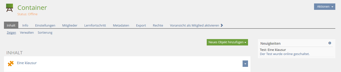 When a test object is set to online, a corresponding news item is generated, containing the test's title, as well as the information itself. The test is also linked, so it can be opened easily. When the test is set to offline again prior to any participants have taken the test, the news item gets removed, so there is no confusing information left.