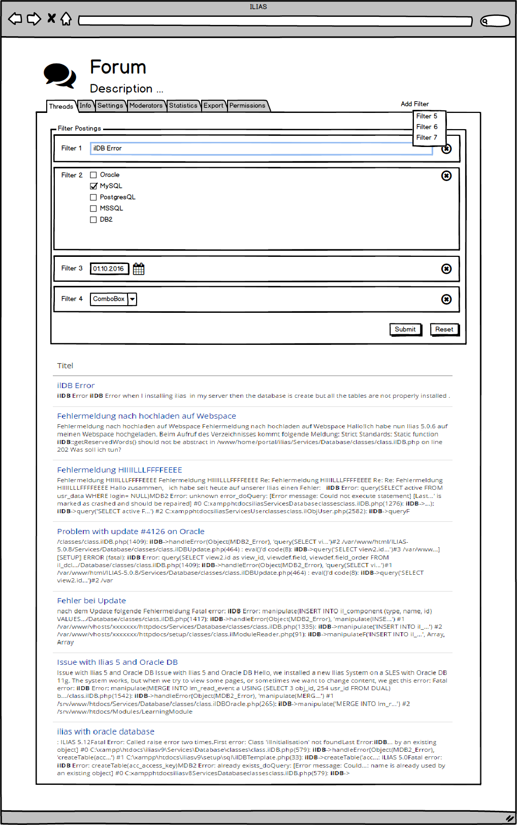 • A filter element (e.g. Responsive Table Filters when it will be part of the ILIAS core in the course of the implementation of Category for Huge Amount of Data) containing the active metadata field definitions (as input elements of type: text, date inputs, selectbox, checkboxes) should be presetend as a filter bar above the threads table, to create a new method for searching relevant discussions a the contained forum threads. Users should be able to set filter criteria and submit the form. The filter is finally applied and ILIAS presents a list of postings (only postings matching the criteria are displayed).