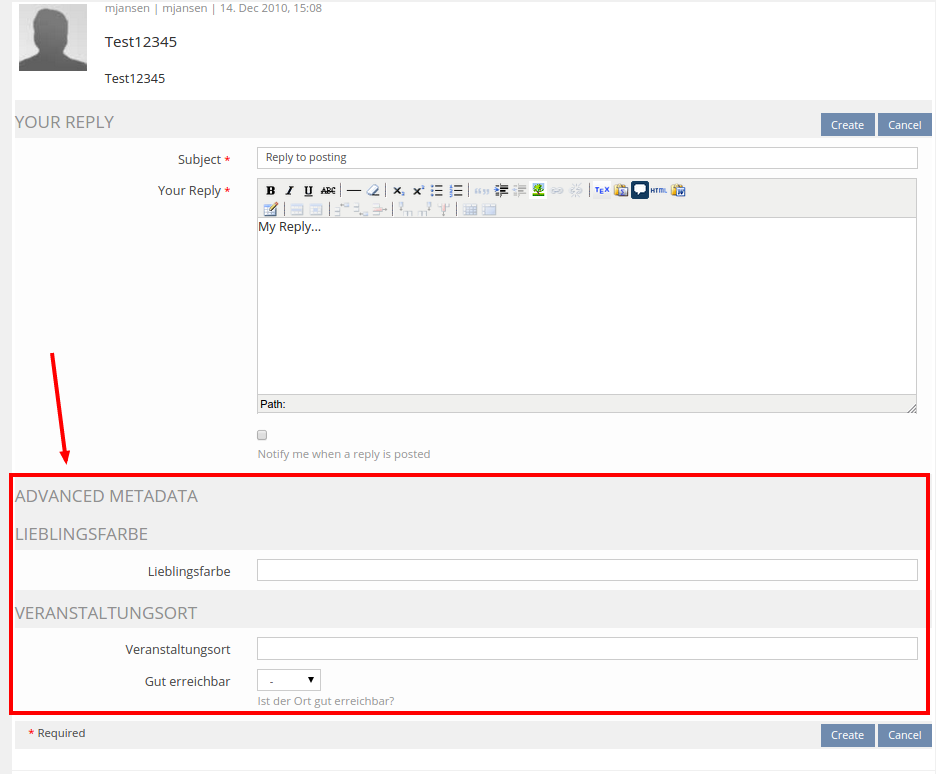• Where are the metadata of postings presented in the forum? The current presentation of custom metadata in wikis cannot be re-used as there is not enough space for an additional right column on the thread view of a forum (esp. when 'Sort by Posts' is enabled).