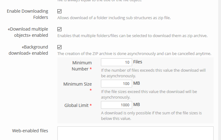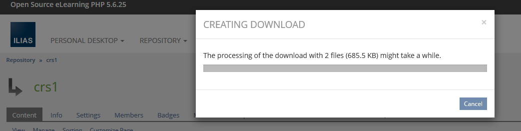 - Only one download is allowed per user. If a user tries to start a second download process, ILIAS has to ask if the first process shall be killed or continued (instead of a new second download). Please use Interruptive Modal as GUI element.