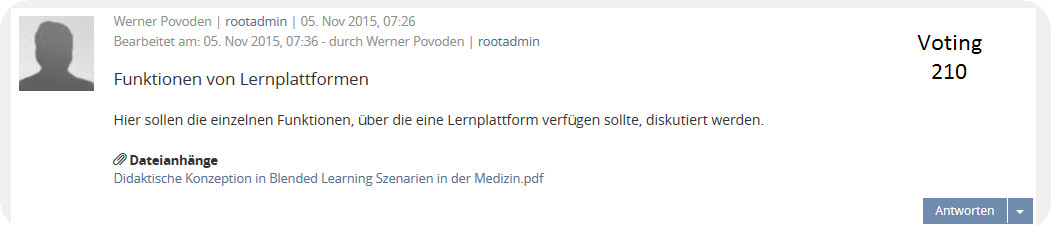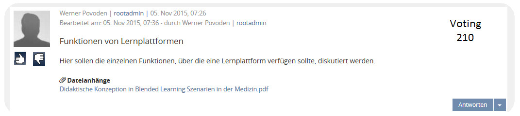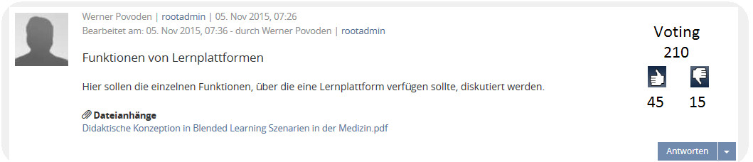 In der nachfolgenden Abbildung ist ein Entwurf zu sehen wie sich das Likesystem, sofern es aktiviert ist, darstellt. Bei jedem Beitrag innerhalb eines Forums wird am oberen rechten Rand des Beitrages ein Feld eingeblendet indem der Text ,,Voting" steht. Unterhalb des Textes wird der numerische Wert der insgesamt abgegebenen Bewertungen angezeigt.