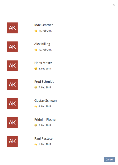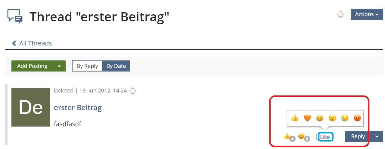 It is not possible to react to new entries, as users are used to in social networks. Most messengers / communication systems offer the chance to approve / disapprove of a statement by using emoticons to express a certain feeling.