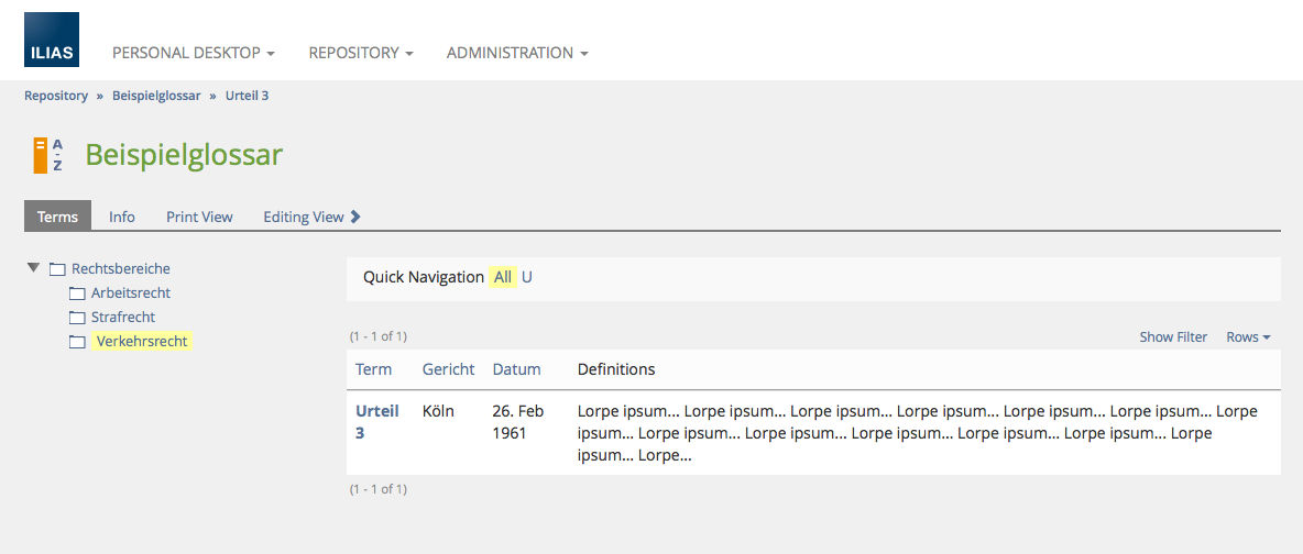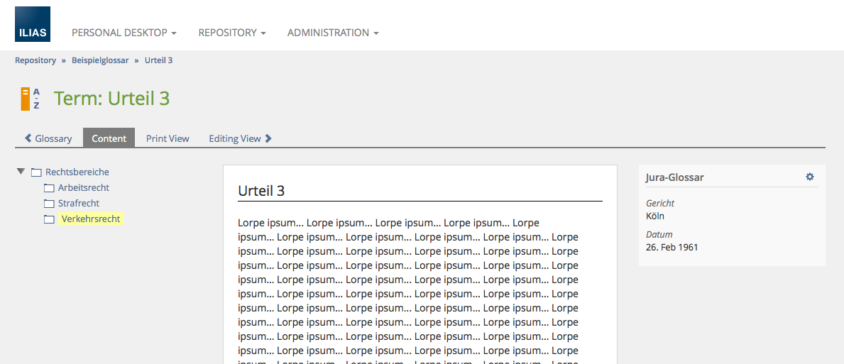 Presentation view of a glossary using a taxonomy. After clicking a taxonomy node and a related term, the term is displayed together with the taxonomy on the left.