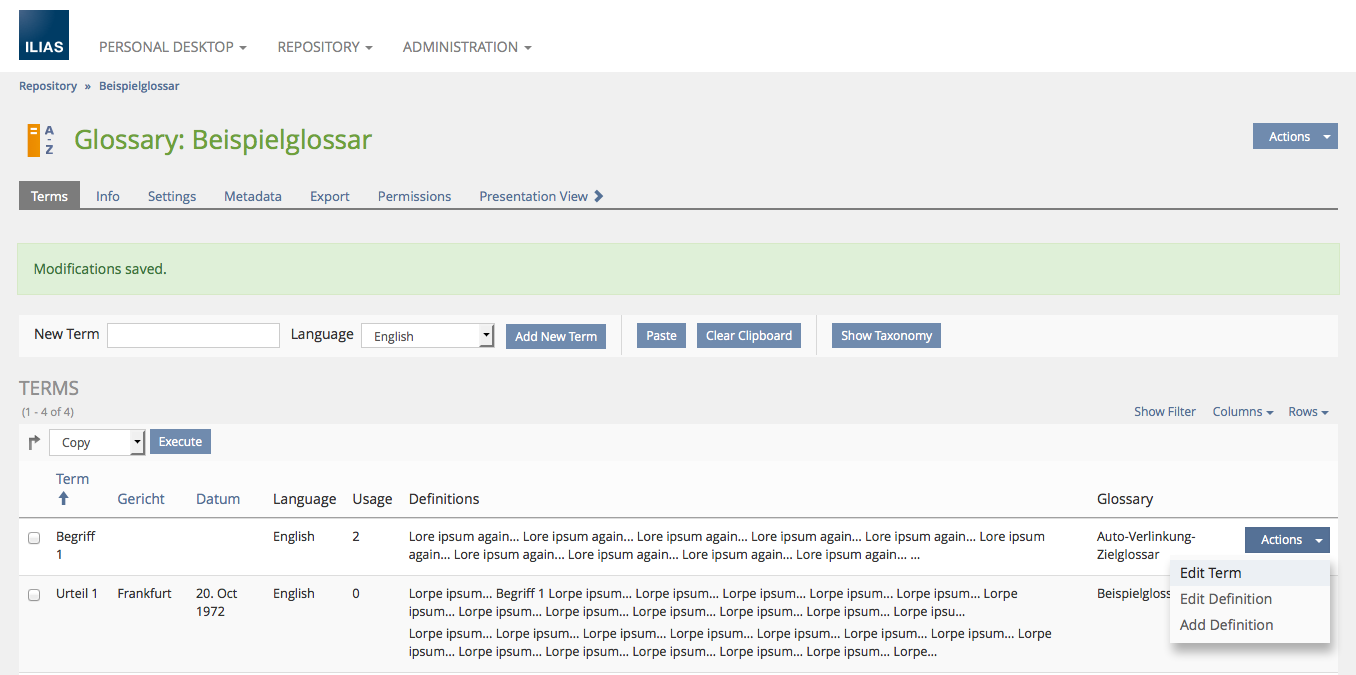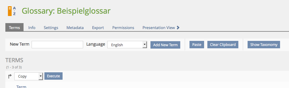 Ansonsten ist der Workflow ähnlich wie beim Feature "Glossarbegriffe" kopieren. (Auswahl per Checkbox in Liste der Begriffe, Klicken "Verknüpfen", Öffnen des Zielglossars, dort "Einfügen" klicken).
