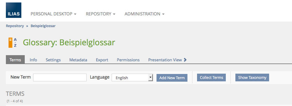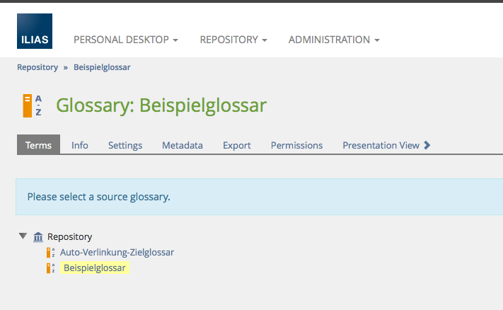 Es soll möglich sein, Begriffe aus anderen Glossaren in ein Zielglossar zu verknüpfen. Verlinkungen sind dabei gleichberechtigt. D.h. sobald ein Begriff in ein anderes Glossar verknüpft wurde, können Benutzer mit Schreibberechtigung am Zielglossar auch dort die Begriffe editieren. Änderung in einem Glossar wirken sich dann sofort auf die verknüpften Begriffe in den anderen Glossaren aus.